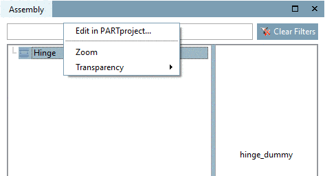 On assembly level you have the context menu commands Edit in PARTproject..., Zoom and Transparency available. On the right in dialog, the dummy starter part can be selected.