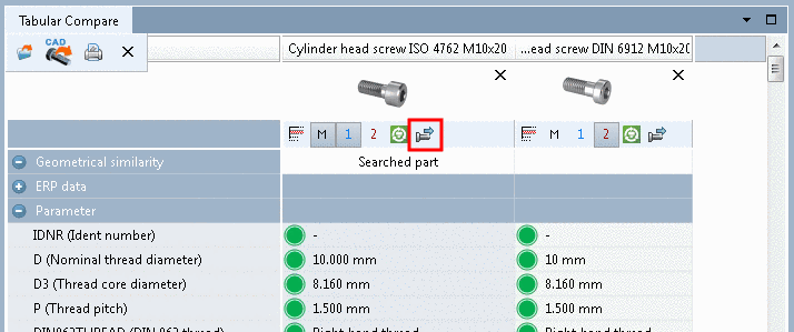 The displayed percent value may slightly differ from the actual best possible value. It refers to the precalculated part. In order to ensure short calculation time at big tables not all parts are precalculated.[57]When a part is loaded the missing data is calculated on the fly, so that the depiction in 3D comparison and 2D comparison is always correct. In order to see all available single parts (characteristics) of the family table, simply load the search part and the compare part either in the Part view or in the Part comparison. | |