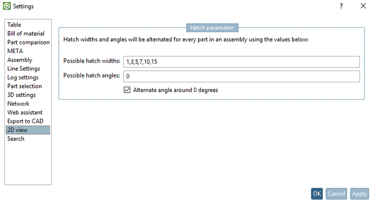 Sectional cuts are marked by hatches in the 2D preview. How these are changed for each part of an assembly can be configured via the following settings: