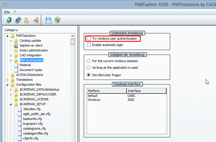 In order to engage the Windows user authentication, mark the Try windows user authentication checkbox after you have activated the option ERP environment in the Category tree.