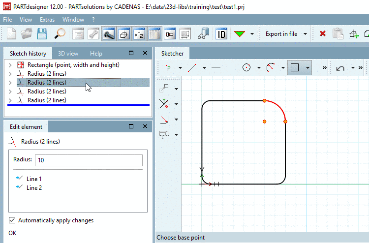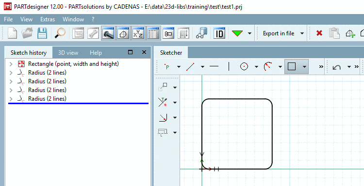 -> Furthermore the single roundings are created in the Sketch history. They are according to those created with the function Radius with 2 elements