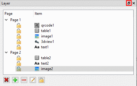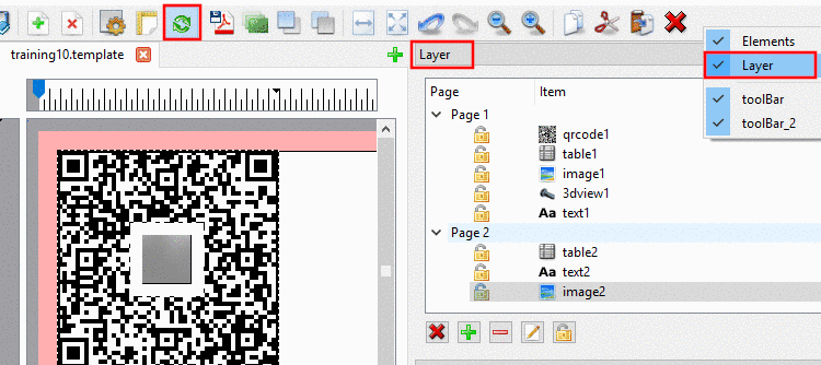 Each element (logo, derivation, technical views, table, etc.) is positioned on its own layer. All elements used in the template are listed on the tabbed page Layer. The sequence mirrors the layer position. The higher a list entry, the further in front the layer of the respective element will be.