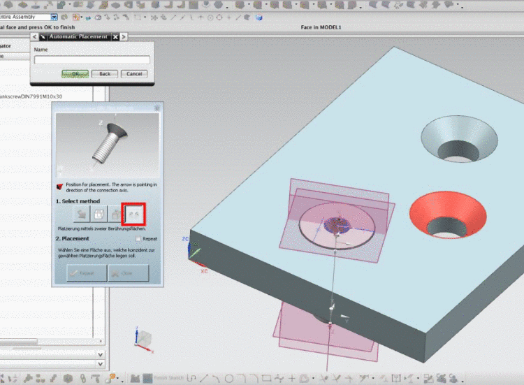 As of version 9.04 a PARTsolutions placement option can be used for countersunk bolts. With one single click all needed constraints are generated.