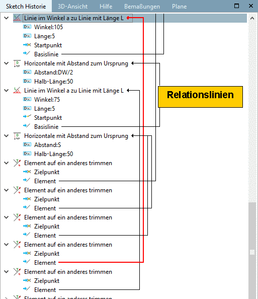 • In the docking window Sketch history you can find main and subordinated features.