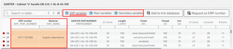ERP variables: Variables not managed in the characteristic attribute table, but in the link database (only relevant with ERP integration). This is about data coming from connected systems such as ERP/PDM, meaning e.g. ERP number, material, price, storage, release state, etc.