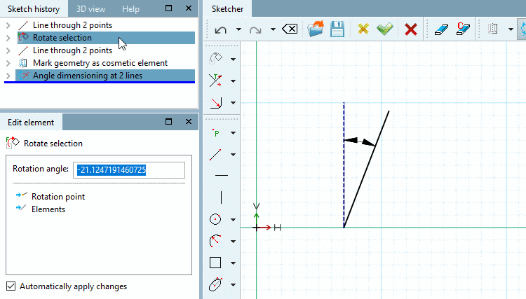 -> Once the second point is fixed the element is immediately rotated through the angle spanned by the two lines.