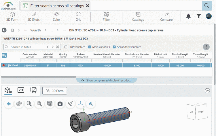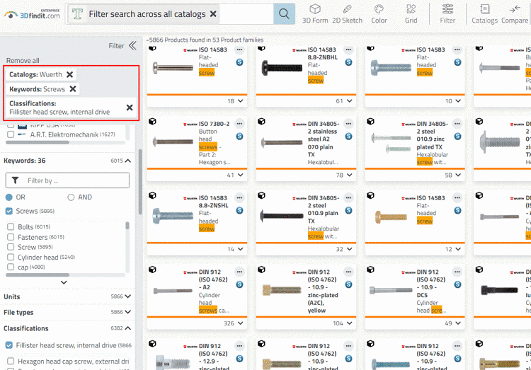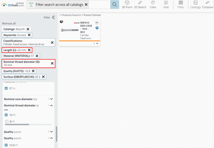 -> In the course of specifying, more and more variable filters are shown (for screws nominal thread diameter and length, for example).