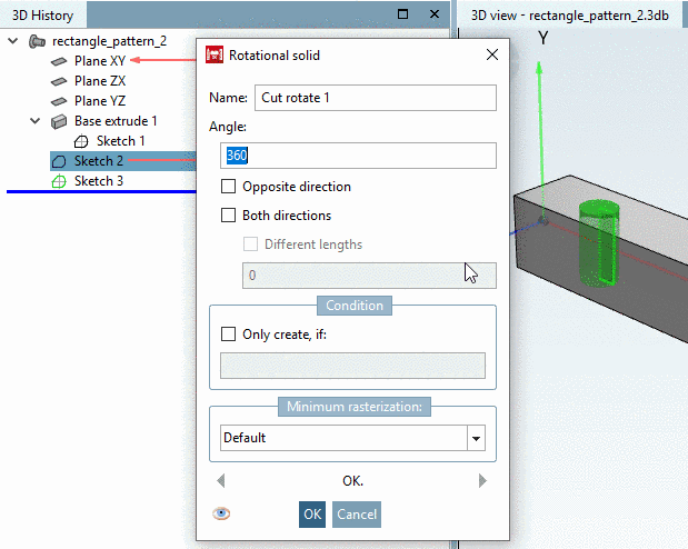 Final result: The boring pattern has been inserted. In the 3D History, you can see the design step Pattern.