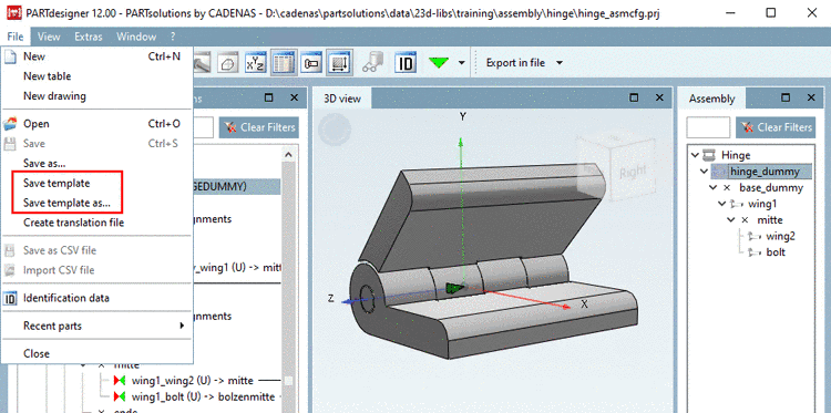 The commands Save template and Save template as... are only available in the File menu, if the docking windows Configurator/Assembly are active.