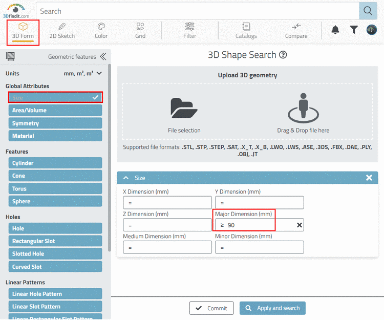Wählen Sie Size und tragen Sie unter Major Dimension >= 90 ein.