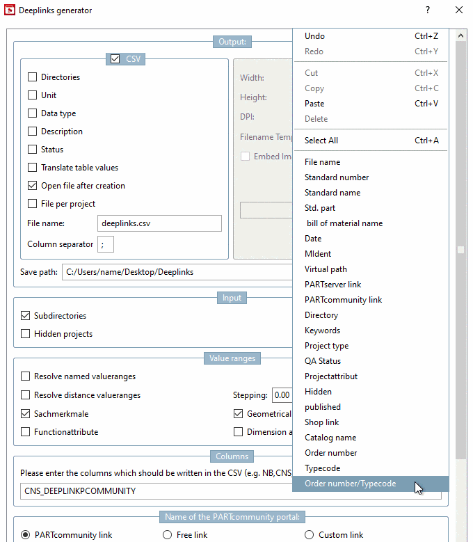 When using the function as Deeplink generator, the entry "CNS_DEEPLINKPCOMMUNITY" is mandatory. Optionally, other columns can be stated. (Compare above output example.)