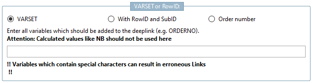This option enables free input of variables. If uniqueness of a deeplink is ensured (for example if option Custom link is used), the field can remain empty, otherwise uniqueness has to be ensured by entering appropriate variables, unless only part families shall be linked.