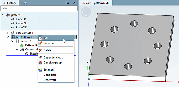 -> The rectangular pattern is displayed in the 3D history [3D History] under Grp Pattern.