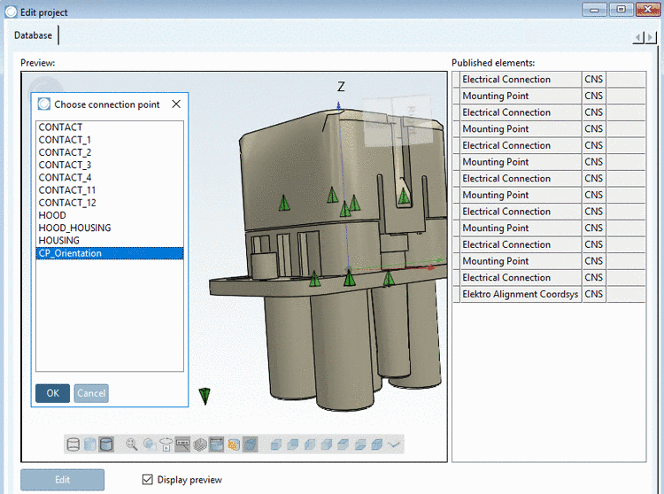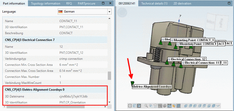 In PARTdataManager, in the docking window Part information, the classified Connection point is displayed as CNS_CP|4|5 Elektro Alignment Coordsys.