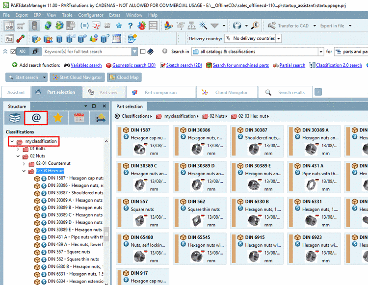 Start PARTdataManager, select the tabbed page Classes and select your own classification. The automatically assigned parts are displayed.