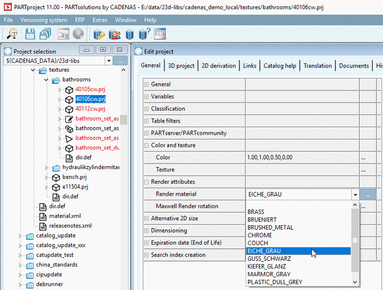 Under PARTproject -> Edit project -> tabbed page General -> Render attributes -> Render material, you can choose, newly create or edit the render material for the selected part.