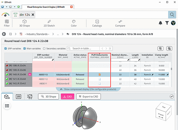 The ERP_PDM_NUMBER column indicates whether a part is managed. The article number is then displayed in this column. This information is usually sufficient for design purposes. However, for administration, for example, it may also be of interest to know which parts have actually been exported or whether a CAD document exists for the part. The ERP_PDM_NUMBER column does not say anything about this. This information is provided by the PLMTABLE_DOCVIEW column using corresponding icons.