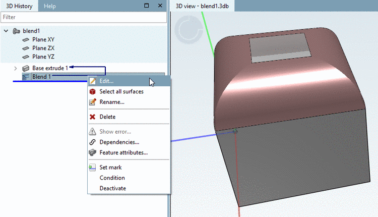 Note If a preview is displayed or only Edge visualization is used depends on the setting under Extras menu -> Settings... -> PARTdesigner -> Chamfer/Fillet -> Preview presentation.