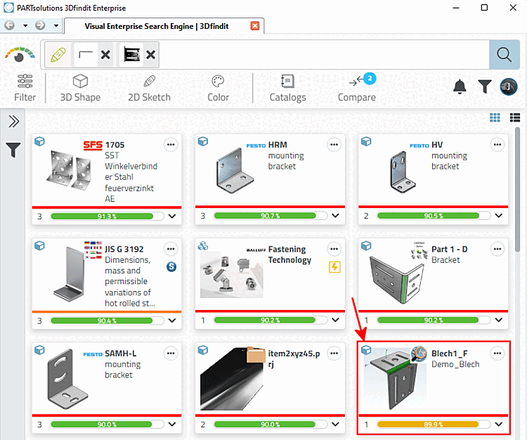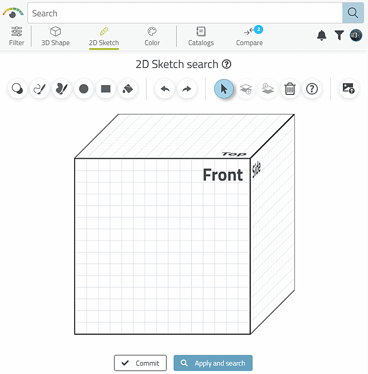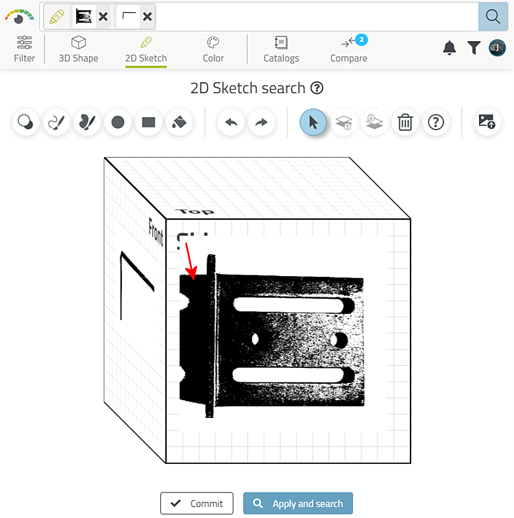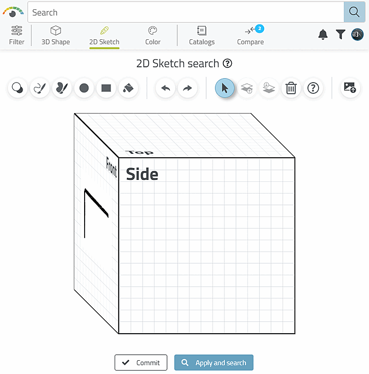 -> The 2D sketch search [2D Sketch search] with the cube for entering a maximum of 3 sketches is opened.