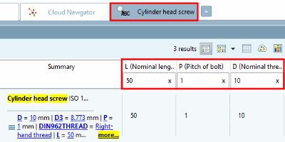 In this mode you can both access the part family and the characteristics within. Initially the result list is displayed compressed only with part families. But when clicking on the