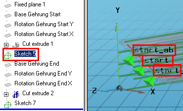 1. In the Variable Manager, insert the variables SAX, SAY (start side) and EAX, EAY (end side) for the input of the miter angle; in addition SDX, SDY, EDX, EDY with Status Attribute algorithms as help variables to calculate the Distance plane (see figure below).