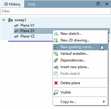 On the 3D history [3D History] tab page, click on the context menu command New history sketch.... [New guiding curve...]