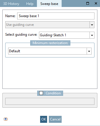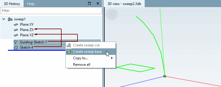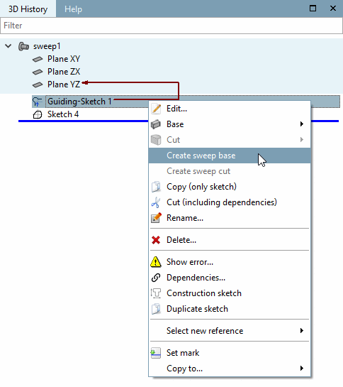 In the context menu of Guiding sketch, click on the Create basic history [Create sweep base] command.