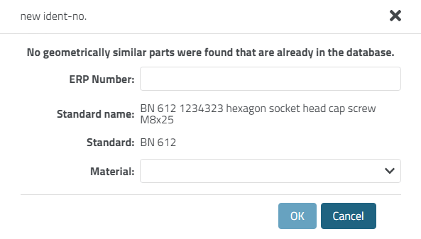 4. You can now choose not to create a new part or enter a new ERP number (and material) and confirm with OK.
