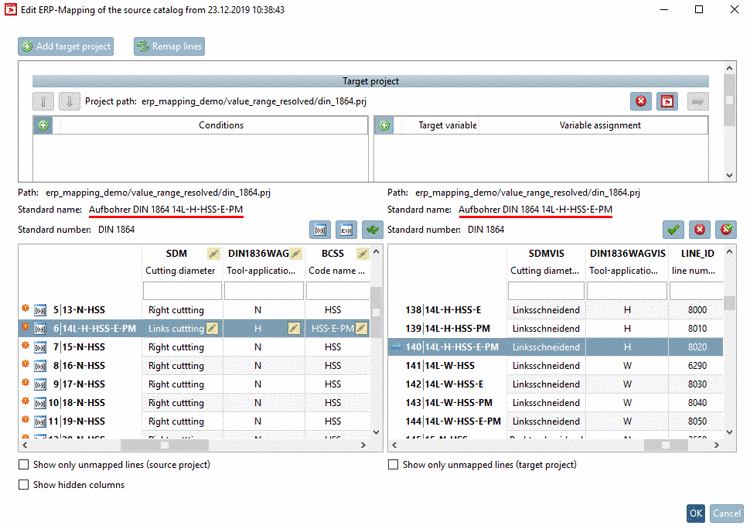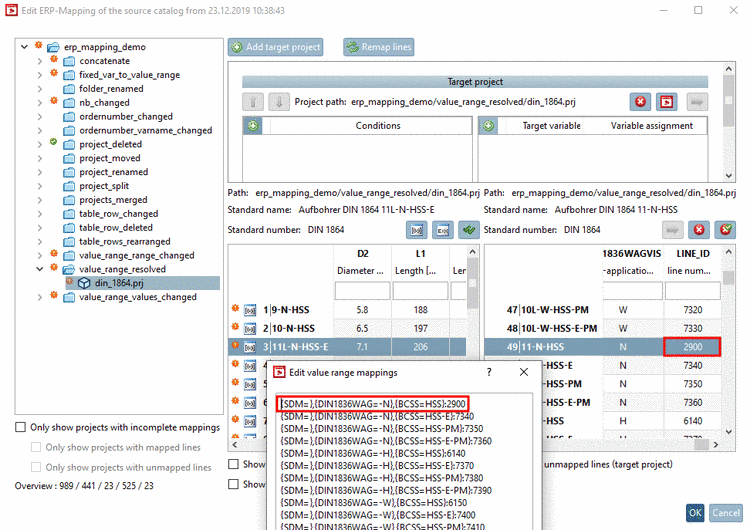 .-> Now the dialog box Edit value range mappings shows a listing of all possible value range combinations (the single values separated by semicolon). At the end of each line, separated by colon, you can see the LINE_ID.