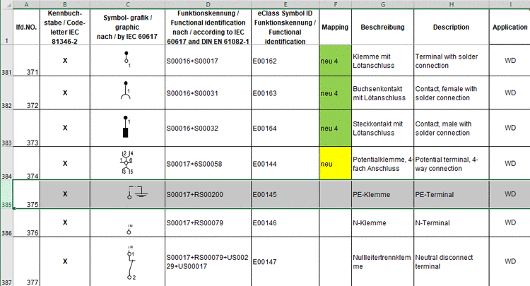 The following figure shows a table with CAx functional symbols. (stored CADENAS internally in the Excel table eCl@ss CAx_Funktionssymbole 24.02.2018.xlsx).