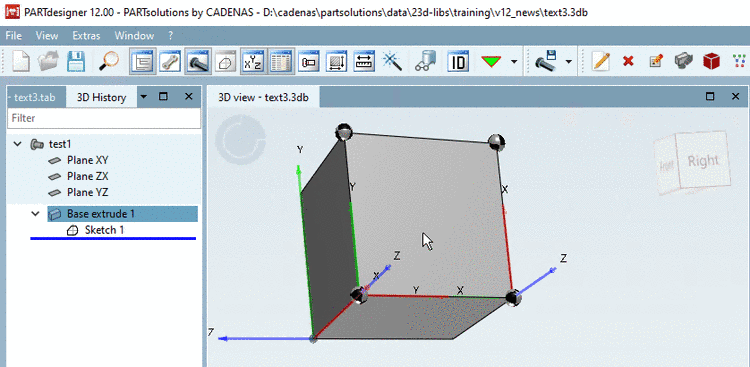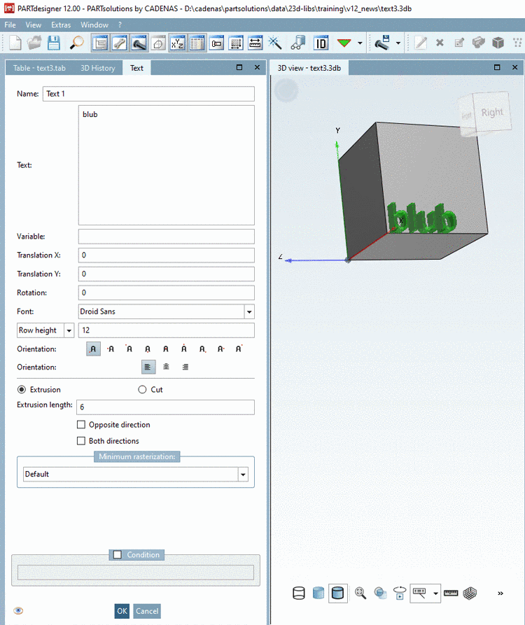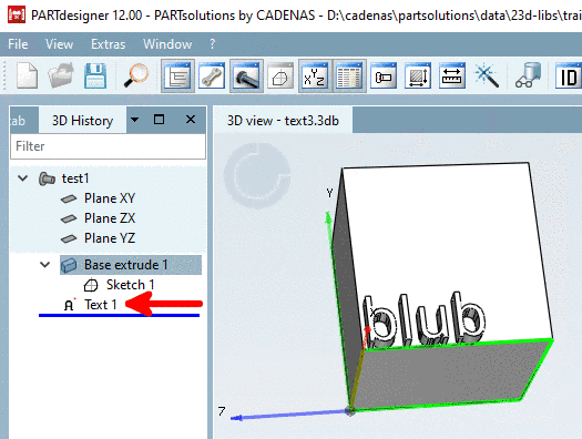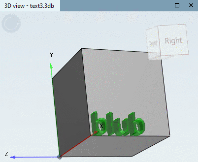 Near the desired zero point ("sphere"), select the desired text orientation (red X axis). The blue arrow then points in the positive direction of extrusion.