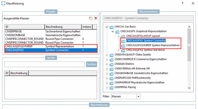 Set the classes CNSCAX|GFX|SYMREP (symbol representation) and CNSCAX|GFX|1 (symbol connection) and for each enter the instance number.