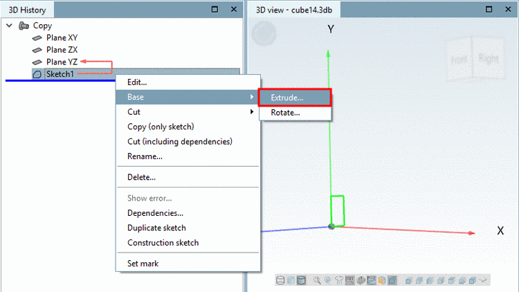 -> The command Extrude... opens the dialog box Extrusion solid.