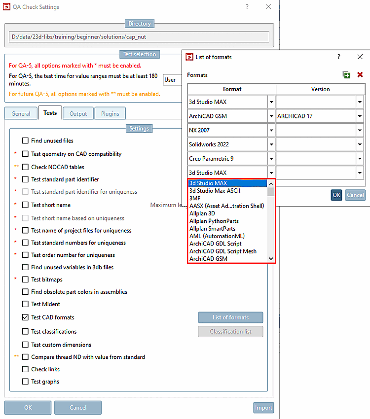 In the QA Check Settings dialog, under Test CAD formats -> Format list [List of formats], the formats are now displayed in alphabetical order.
