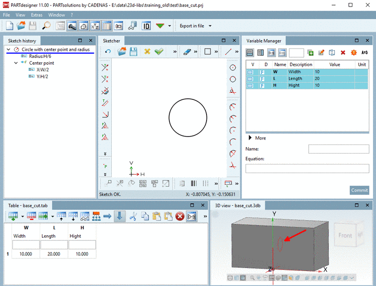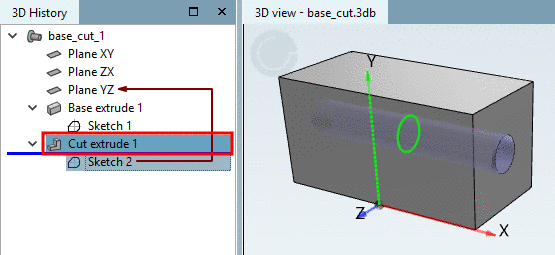 -> In the 3D History, another point (feature) shows up: Cut extrude 1.