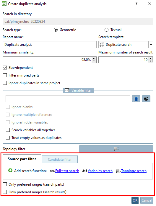 For example, you could also use a topology search [Topology search] to define a specific group of parts for which the duplicate search should be carried out (e.g. axially symmetrical parts larger than 700 mm).