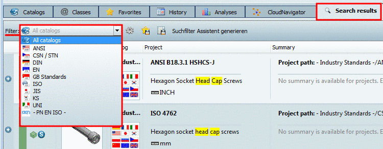 After Full-text search or Variables search a Catalog filter is displayed. If hits have been scored in different catalogs, then now you can restrict the results to a certain catalog afterwards.