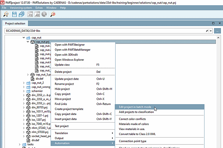 3. Call up the function in PARTproject in the catalog index on a project or directory via the context menu command under Automation -> Edit project in batch run [Edit project in batch mode].