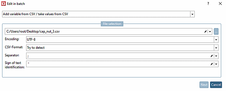 • Enter a CSV manually or use the Browse button ... button to select one or more (Ctrl key) CSV files. If several are selected, they are separated with the pipe symbol.