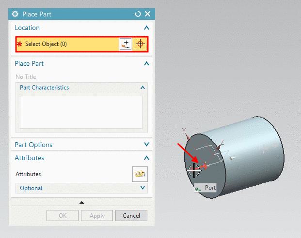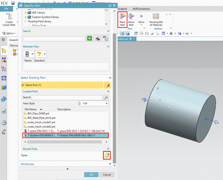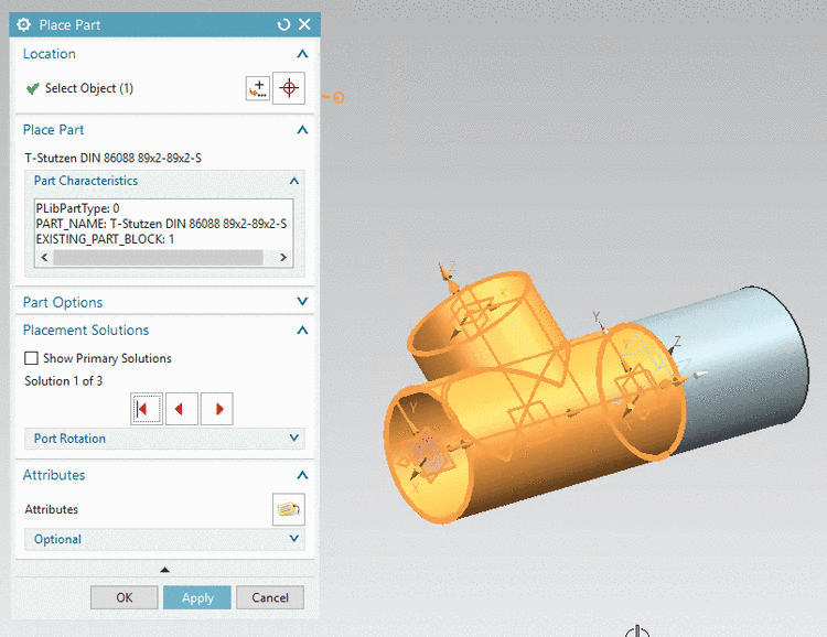 In the following is described how you can insert a PARTsolutions part with the NX standard procedure. Here in this example, the inserted part is connected with a manually created (see Section 5.12.14.6.1, “Design parts in NX via path structure and "Stock" function”).