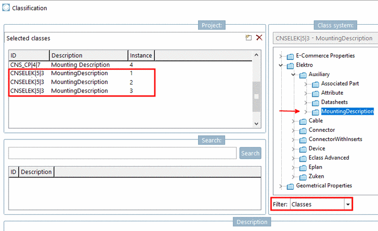 In the Filter, set the option Classes and under Elektro -> Auxiliary, via double-click on the class Mounting Description (CNSELEK|5|3), add the needed number of appropriate instances (1,2,3,4,...).
