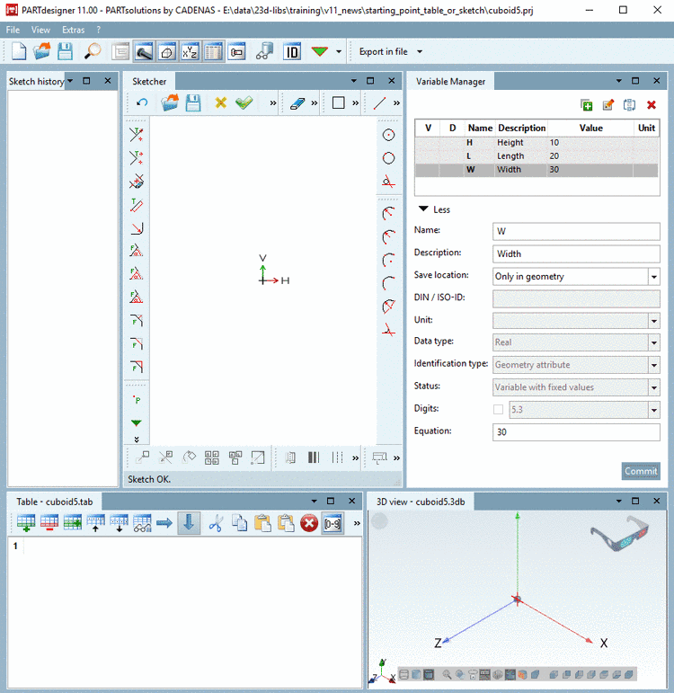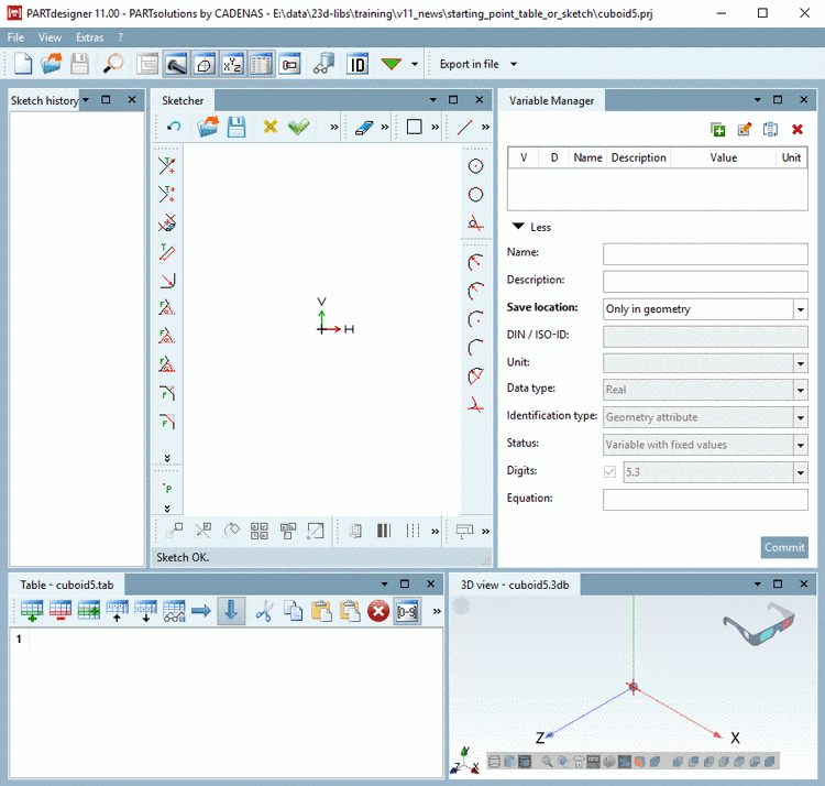-> PARTdesigner is opened with the docking windows 3D History, 3D view, Variable Manager and Table.