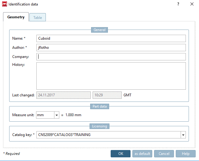 .-> The Identification data dialog box is opened with tabbed page Geometry.