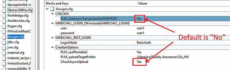 In the configuration file ifwwgm.cfg, the keys PLM_UseAsyncTransaction(isINVENTOR) and CheckAsyncUpload are turned off by default.