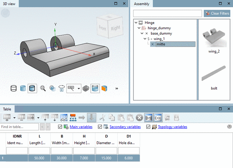 When selecting a table row the assembly is built up accordingly.