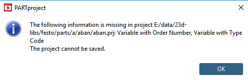 Note If under PARTproject -> Edit project -> tabbed page General -> Variables -> Variable with order number and/or Variable with Type Code a respective entry is missing, an error message is displayed.