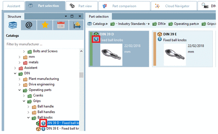 Parts classified as standard part, are shown in PARTdataManager under Standards classification and are marked with an icon, so that they can quickly recognized when browsing through the catalogs. Furthermore a search can directly focus on them. Also compare Icon - Standards Klassifikation.