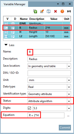 You can recognize at the color code where the variables L2, H and R are saved. For the creation of the table, using the option Save location "Only in table" (color code