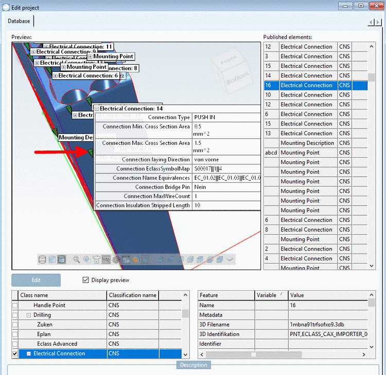 In this example the attributes Connection type, Stripping length and Wire connection cross-section, solid core, max. specified in the datasheet shall be classified.