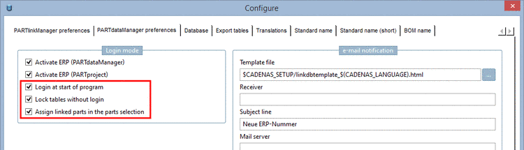 PARTlinkManager -> Extras menu -> Configure ERP environment -> dialog box Configure -> tabbed page PARTdataManager preferences -> section Login mode